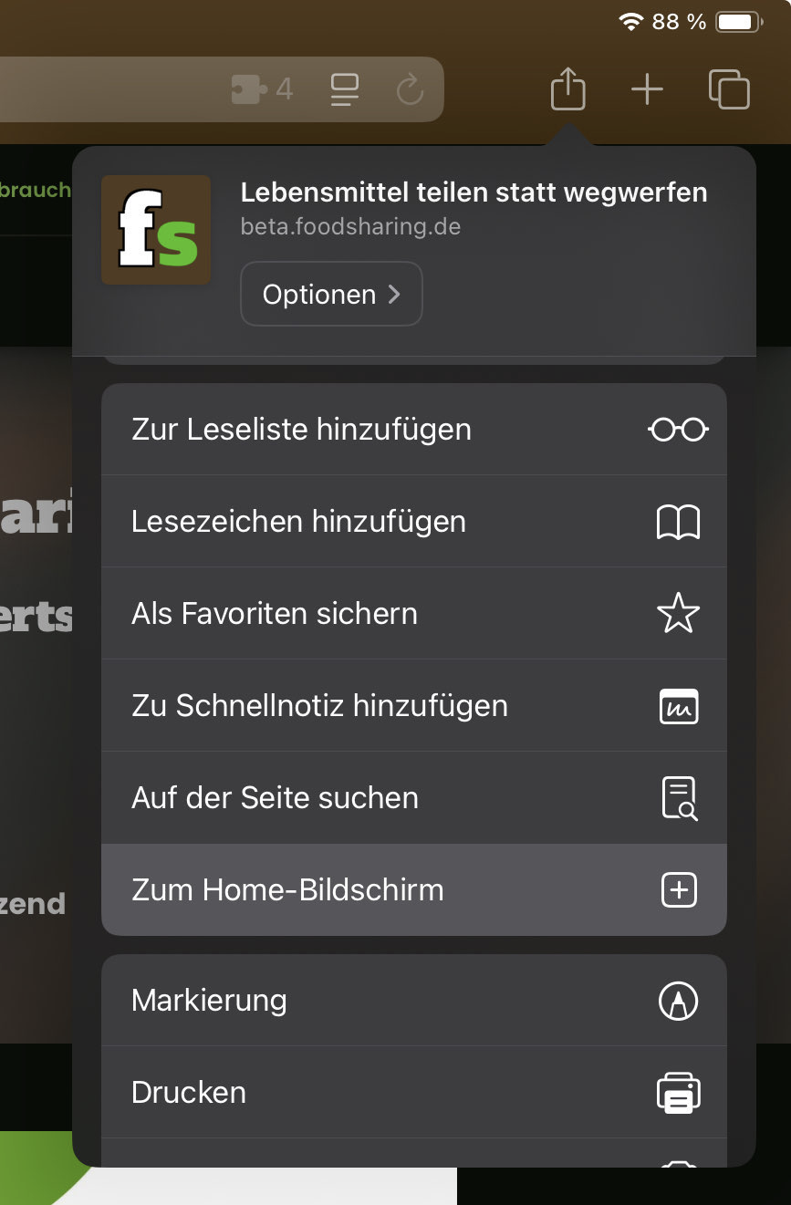 Wie kann ich auf iPhone oder iPad foodsharing zum Home-Bildschirm hinzufügen?
