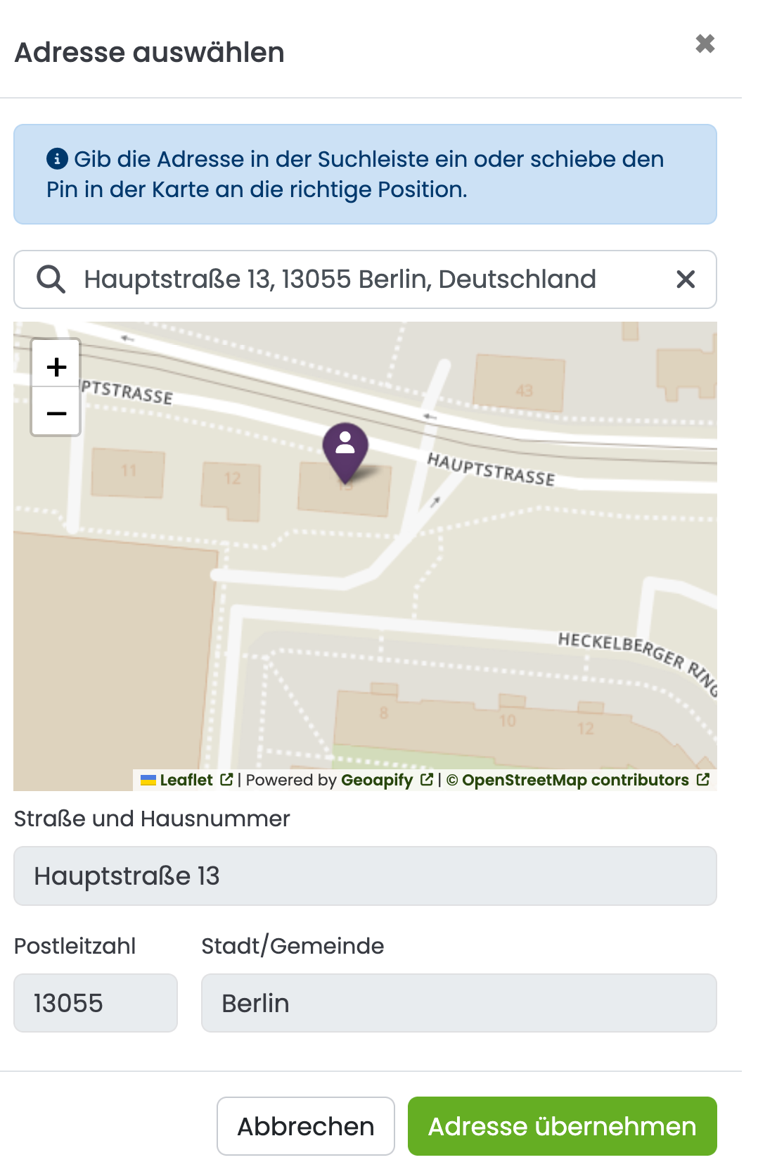 Anschließend kannst du die Adresse unterhalb der Karte in den Adressfeldern überprüfen und ggf. ändern und anschließend auf "Adresse übernehmen" klicken.